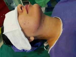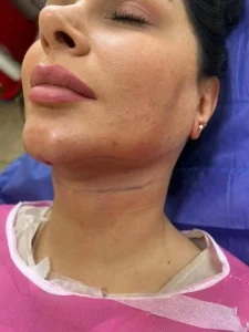 ۵. بستن برشها و بانداژ: بخیههای ظریف زده میشود و بیمار باید چند هفته گن یا بانداژ مخصوص گردن استفاده کند تا پوست روی ناحیه جدید فیکس شود.